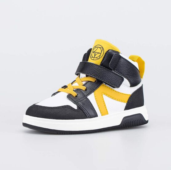 Демисезонные ботинки для мальчика выполнены в сочетании ярких контрастных цветов: белого, черного и желтого. Пухлый текстильный язычок с принтом подчеркивает модный стиль.