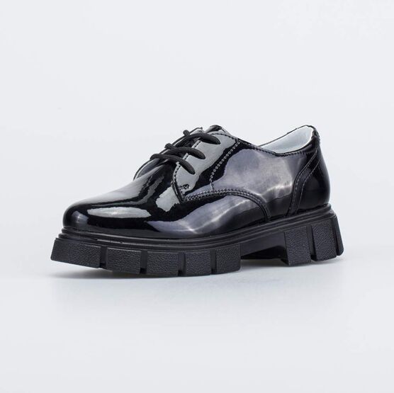 Верх выполнен из натуральной кожи с лаковым эффектом. Подкладка и несъемная стелька сделаны из мягкой натуральной кожи белого цвета, - такой вариант обеспечивает комфортный микроклимат внутри обуви и не окрашивает носочки. Элегантный стиль подчеркивает классическая шнуровка, при этом модель удобно надевать и снимать с помощью молнии.