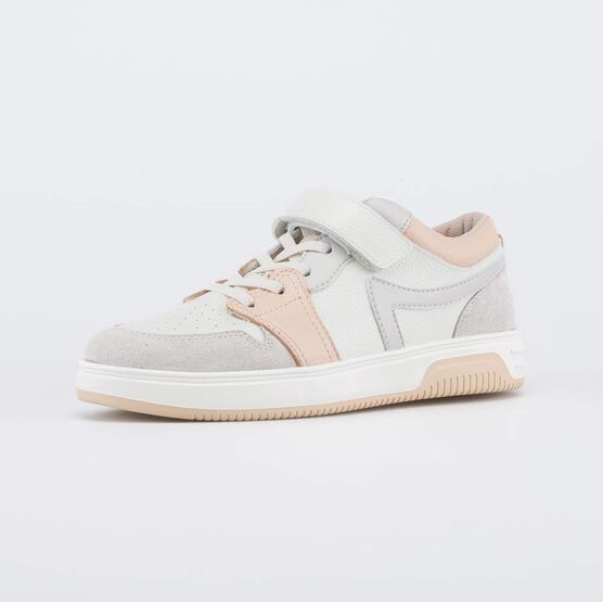 Кожаные кеды-полуботинки выполнены в сочетании светлых оттенков серого и бежевого, и подходят для девочки школьного возраста.
