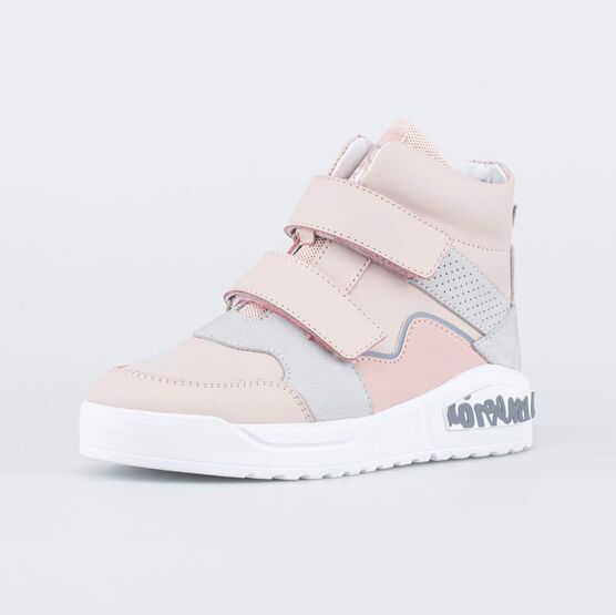 Верх выполнен из сочетания нежных цветов: гладкой кожи розового цвета и кожи-нубука серого цвета. Подкладка и стелька обуви изготовлены из натуральной кожи - износостойкого, дышащего материала.