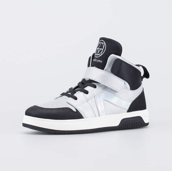 Высокие кеды для девочки созданны с учетом особенностей детской стопы, выполнены в сочетании контрастных цветов (черного и серебристого) и украшены перламутровым элементом.
