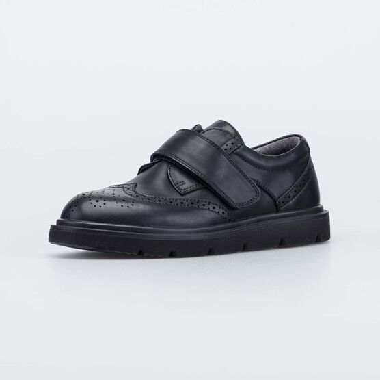 Черные кожаные туфли-броги отличающиеся декоративной перфорацией на верхней части обуви отлично подходят для создания строгих образов, а также в качестве сменной обуви в школу и подходят для мальчика школьного возраста.