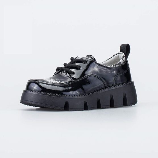 Ботинки украшены модным принтом в виде надписей, лаконичный дизайн позволяет сочетать их со школьной формой.