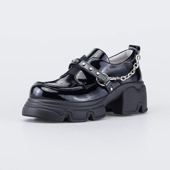 Верх изготовлен из натуральной кожи с лаковым покрытием и декорирован металлической цепочкой. Подкладка и стелька – из мягкой натуральной кожи белого цвета: не придется переживать, что обувь окрасит носочки или колготки.