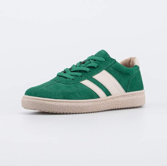 Зеленые велюровые кеды-полуботинки на бежевой подошве отлично дополнят образ мальчика подросткового возраста.