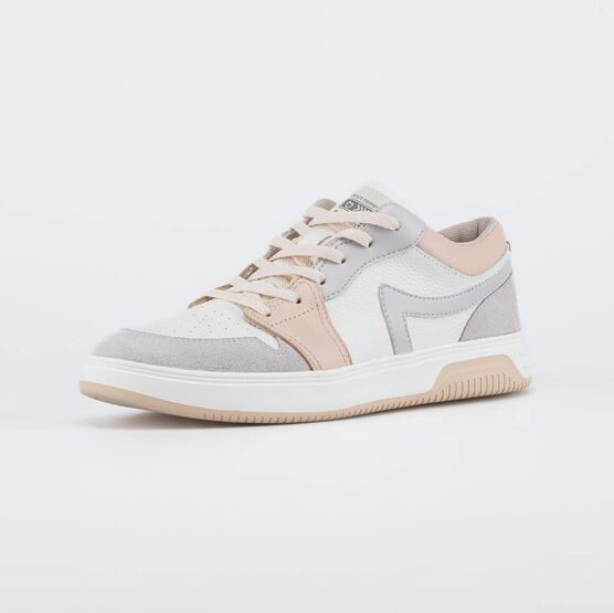 Кожаные кеды-полуботинки выполнены в сочетании светлых оттенков серого и бежевого, и подходят для девочки школьного возраста.