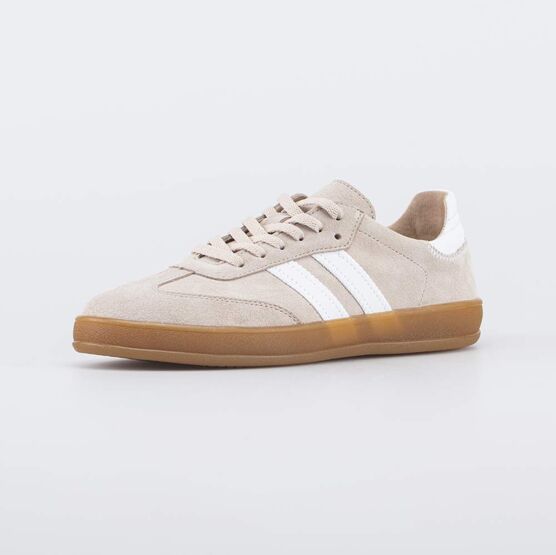 Кожаные бежевые полуботинки-кеды на бежевой подошве отлично дополняют образ мальчика подросткового возраста.