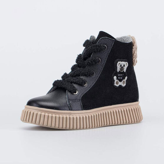 Верх выполнен в сочетании натуральной гладкой кожи и кожи-велюра черного цвета. Манжет украшен мехом под барашка. Тему тактильности продолжает махровая нашивка в виде медвежонка и махровые шнурки.