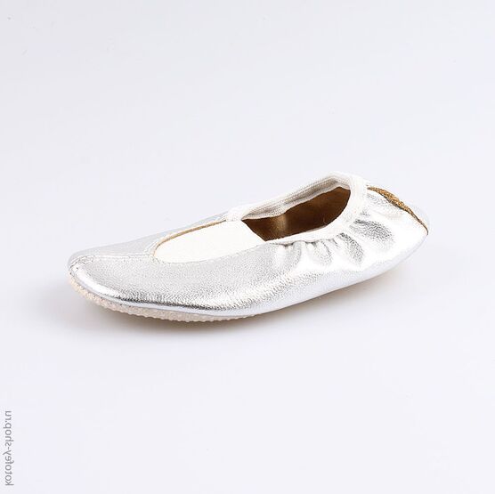 Нарядные детские чешки выполнены из натуральной кожи серебристого цвета. Подходят для праздников, занятий в зале и для активных игр в домашней обстановке.