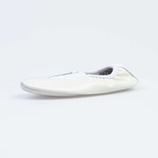 Чешки детские для занятий танцами и гимнастикой выполнены из натуральной кожи и текстильных материалов, в классическом белом цвете.