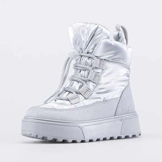 Зимние дутики серебристого цвета, выполненные в стиле ботинок, подходят для девочки-подростка.