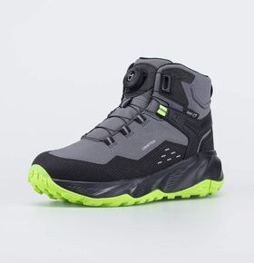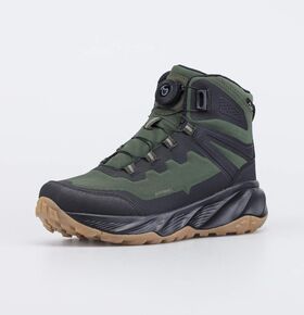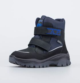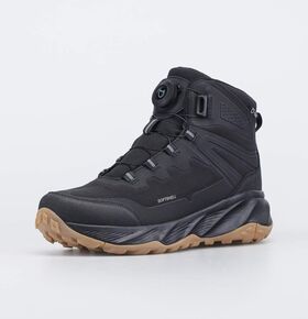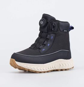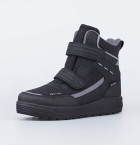 Черные ботинки имеют верх из комбинации ветронепродуваемого текстиля Softshell, натуральной и искусственной кожи. Язычок прошит до верха, чтобы предотвратить попадание снега внутрь. Пятка защищена антивандальной накладкой.