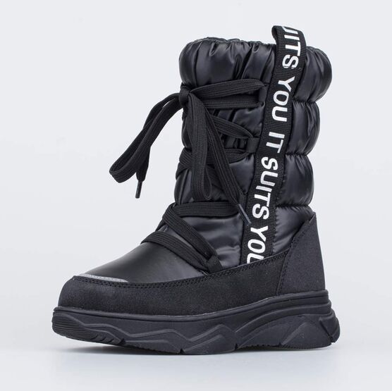 Верх из плотного нейлона имеет текстуру черного шелка и отлично отталкивает влагу и снег, сохраняя ножки сухими.