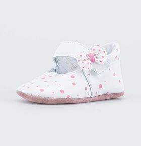 Они мягкие и гибкие, как носочки. Удобные в надевании: на ноге модель фиксируется с помощью липучки. Несъемная кожаная стелька. Нежный вид придает блестящая отдделка кожи и узор-перфорация.