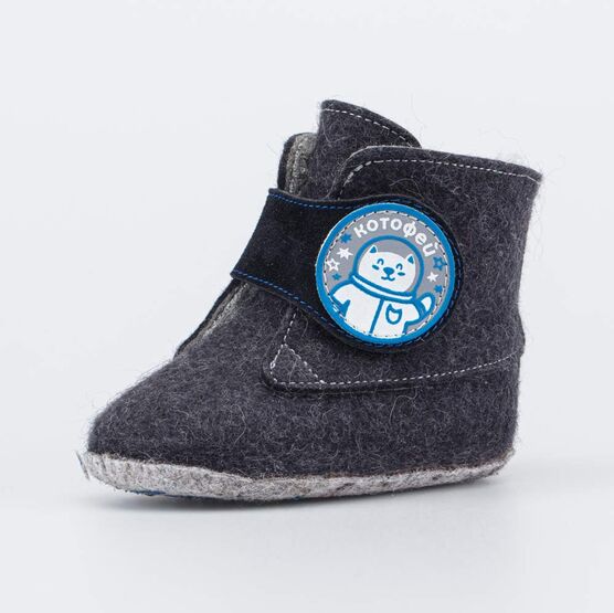 Войлочные пинетки-валенки темно-серого цвета, утепленные мехом из натуральной шерсти, подходят для мальчика.