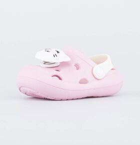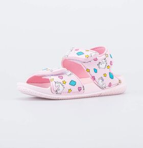 Сандалии выполнены в розовом цвете, украшены перламутровыми деталями и принтом в виде героини известного мультфильма Три кота.
