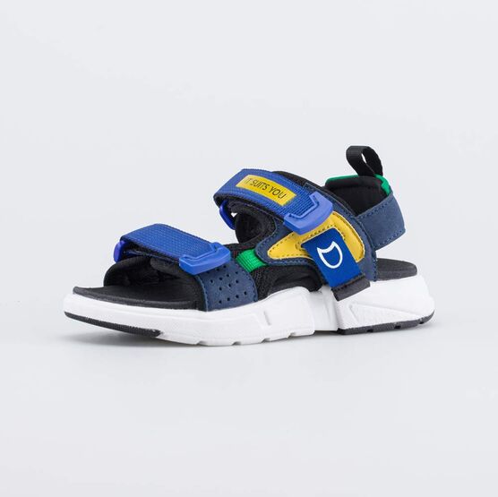 Сандалии выполнены в синем цвете и украшены яркими нашивками с надписями и логотипом Котофей.