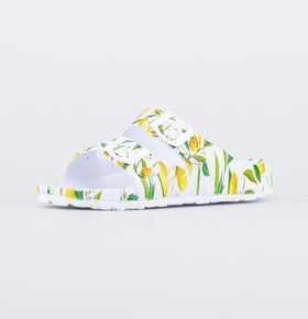 Пляжные шлепанцы с поперечной перемычкой отлично дополнят летний образ девочки, а за счет белого цвета подойдут к любому стилю.