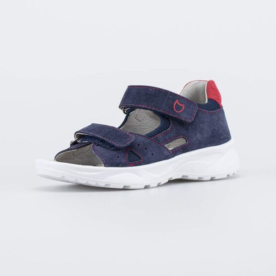 Сандалии для мальчика дошкольного возраста выполнены в синем цвете с красным акцентом.