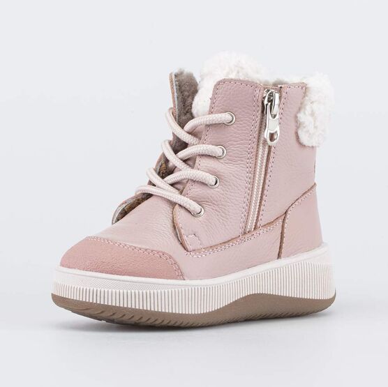 Верх детских ботинок выполнен из натуральной кожи и украшен кудрявым мехом барашек. Носочная часть усилена дополнительной кожаной накладкой с полиуретановым покрытием.