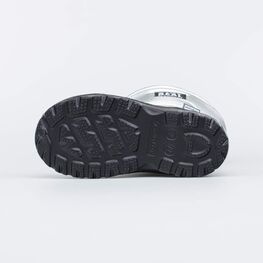 Сапожки серебристого цвета декорированы нашивкой с надписями.