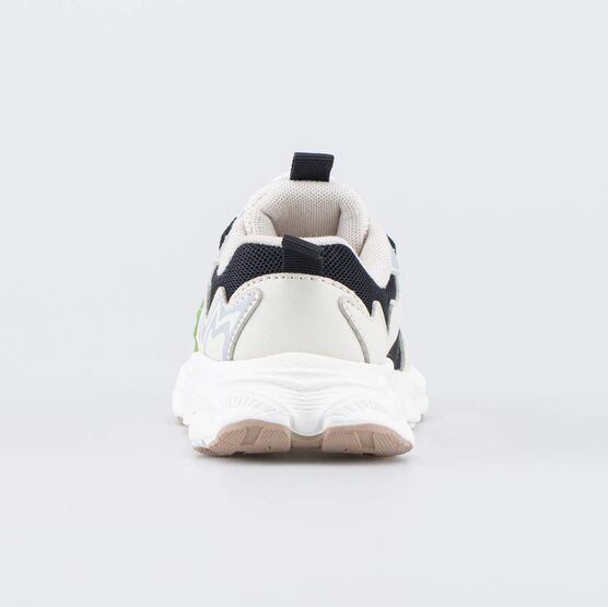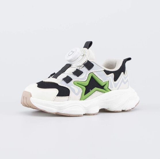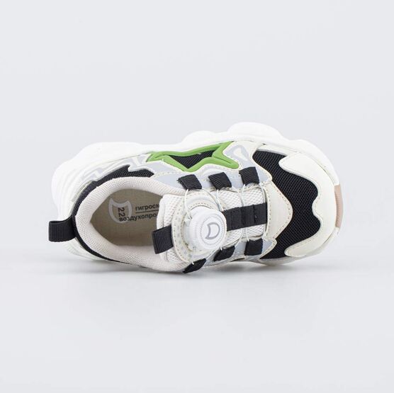 Кроссовки с системой быстрой шнуровки выполнены в контрастных цветах, которые дополнены зелеными акцентами и бежевым элементом на подошве.