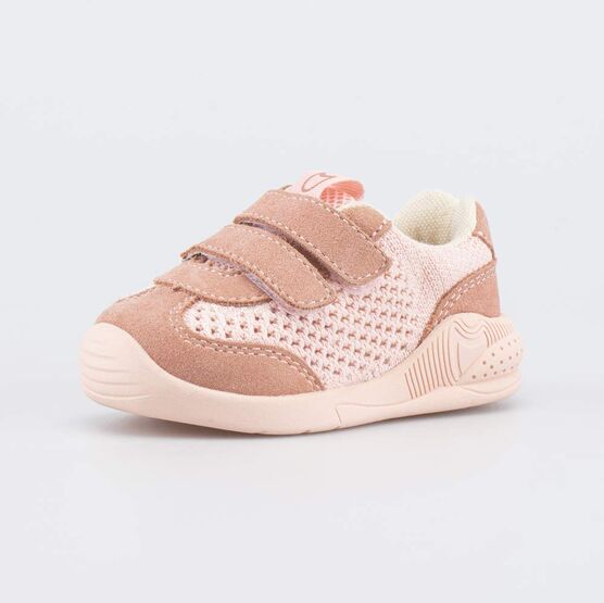 Детские кроссовки из вязаного текстиля выполнены в трендовом розовом цвете и подходят для девочки, которая уже начала активно ходить.