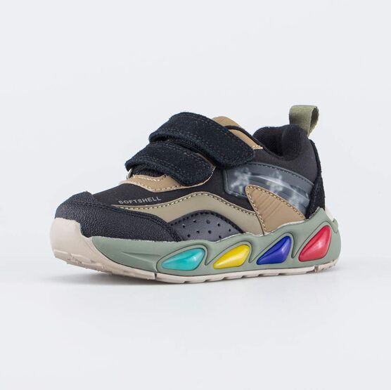 Анатомическая подошва из невесомого ЭВА (этиленвинилацетата) усилена термопластичной резиной для придания устойчивости на детской площадке. Оснащена мигающими светодиодами, которые срабатывают от ударной нагрузки.