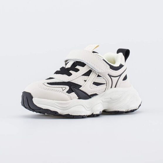 Удобные кроссовки для мальчика дошкольного возраста выполнены в сочетании черного и бежевого цвета.