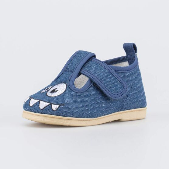 Текстильные сандалии подходят для мальчика младшего возраста, когда ходить уже начали, но еще не совсем уверенно. Украшены вышивкой в виде зубастой рожицы: в зависимости от фантазии ребенка это может быть дракончик или дружелюбный монстр.