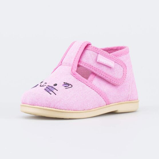 Верх выполнен из текстиля розового цвета и украшен вышивкой в виде милой мордочки котенка. Подкладка и несъемная стелька из 100% хлопка обеспечивают максимально комфортный микроклимат для детской ножки.