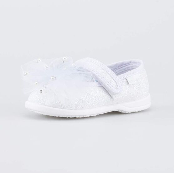 Нарядные серебристые туфли для девочки, украшенные пушистым бантиком с бусинами, подходят для праздника в детском саду или семейной фотосессии.