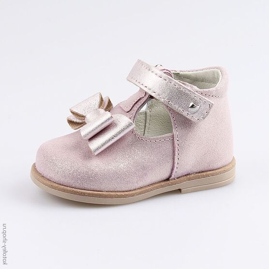 Туфли разработаны специально для первых шагов малыша. Модель выполнена полностью из натуральной кожи с текстурой велюра. Подошва дополнена невысоким каблучком (прим.5-7мм), присутствие которого обеспечивает ножке малыша правильное развитие. Жесткий задник надежно фиксирует ножку, а это значит, что ребенок будет чувствовать себя максимально комфортно. Ремешок с липучкой позволяет легко обувать и снимать туфельки. Модель декорирована объемным бантом с блеском.