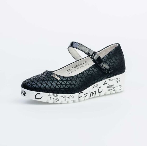 Черные туфли выполнены из высококачественного материала верха с покрытием, Модель крепится на ноге при помощи ремня с застежкой велькро. Стелька из натуральной кожи, дублированная мягким вспененным материалом, обладает свойствами гигроскопичности и воздухопроницаемости, что обеспечит полный комфорт ножке в течение всего дня. Подошва модели клеевая, тренд "Как у мамы" на небольшой танкетке с формулами, понравится даже самой капризной моднице. Правильная форма, универсальное цветовое сочетание то, что нужно для похода за знаниями!