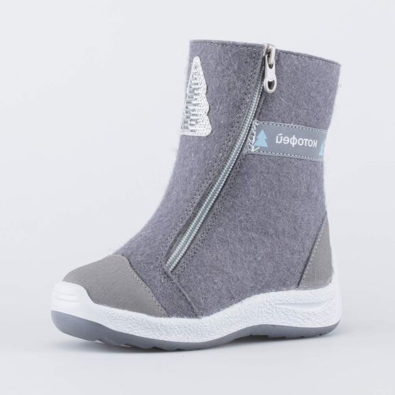 Детские серые валенки на подошве выполнены из натурального войлока и украшены апликацией с серебристыми пайетками в виде елочки.