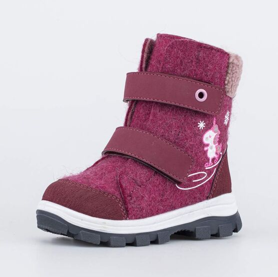 Детские валенки для девочки выполнены из натурального войлока. Войлок плотный, с водоотталкивающими свойствами, дышит и создаёт приятный климат вокруг стопы на улице и в помещении.
