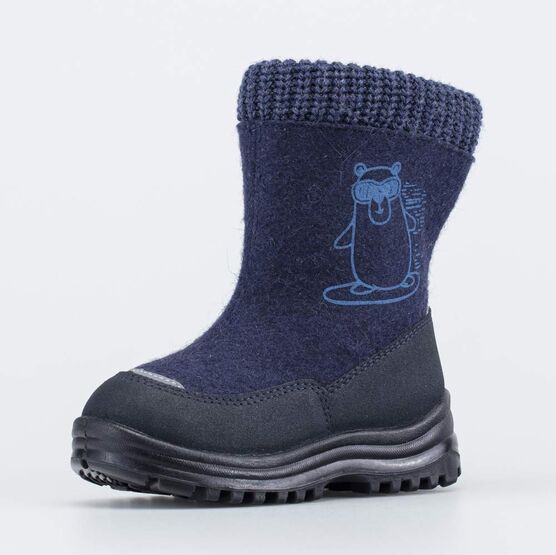 Синие валенки на подошве сделаны из натурального войлока и подходят для мальчика. Войлок плотный, с водоотталкивающими свойствами, дышит и создаёт при этом приятный климат вокруг стопы на улице и в помещении.
