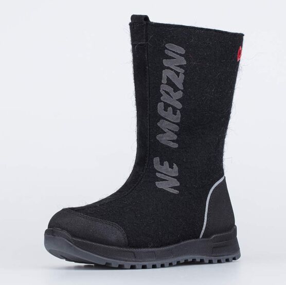 Валенки украшены принтом в виде большой надписи и сквозным декоротивным отверстием. Оснащены светоотражающими элементами.