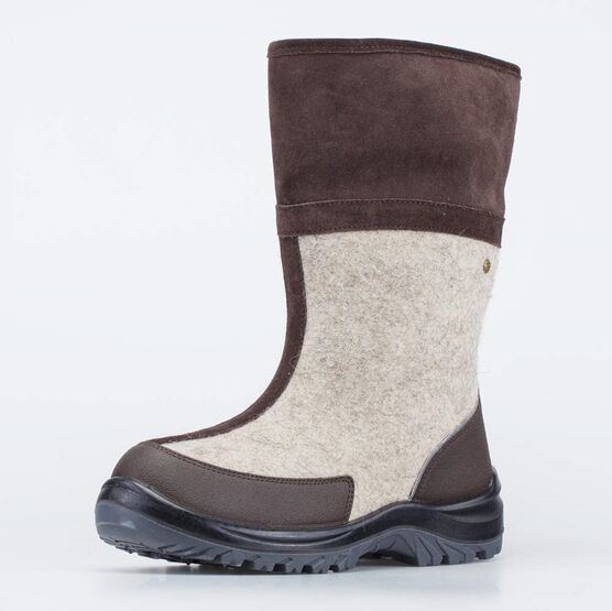 Верх и стелька из натурального войлока (100% овечья шерсть), подкладка из шерстяного меха (натуральные шерстяные волокна вплетены в текстильную основу), верх голенища - натуральная кожа-велюр.