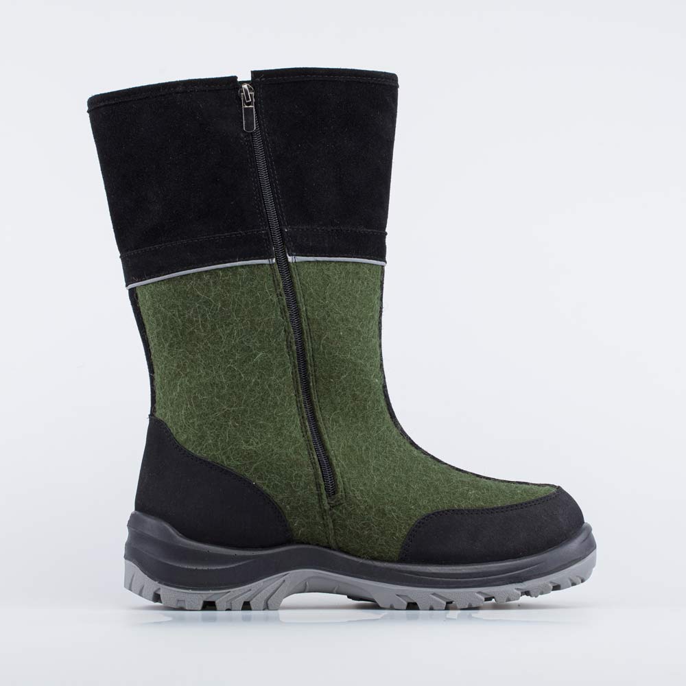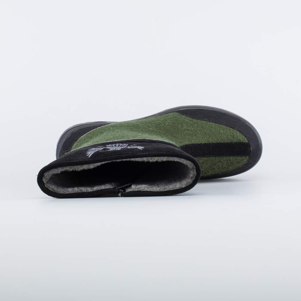 Мужские сапоги из натурального войлока, украшены гербовой вышивкой в виде двуглавого орла. Верх и стелька из натурального войлока (100% овечья шерсть), подкладка из шерстяного меха (натуральные шерстяные волокна вплетены в текстильную основу). Ворс подкладки примерно в два раза длиннее, чем у обычных валенок. Обеспечивают сухое тепло в сильные морозы до - 50, помогают сохранить комфорт при сырой и влажной погоде.