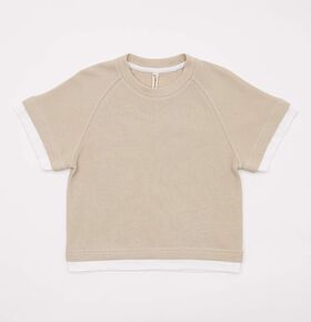 - футболка с рукавами имеет прямой силуэт и длину чуть ниже линии бедер, с естественной линией плеча;