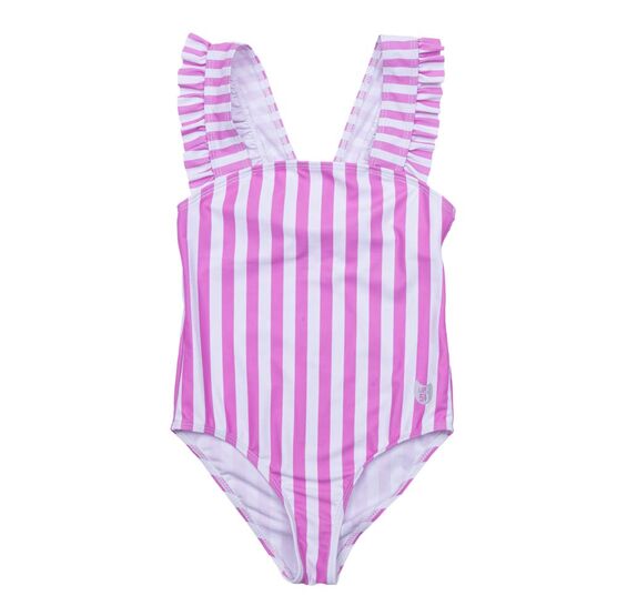 Декорирован рюшами на лямках, бантиком на спинке и ярким полосатым принтом.