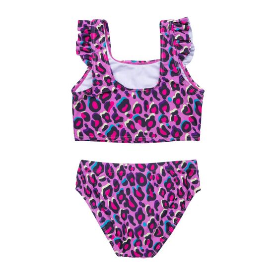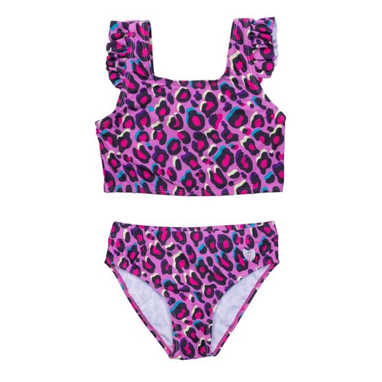 Верх купальника выполнен в виде укороченното топа с широкими бретелями и рюшами.