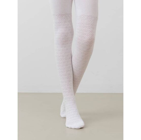 Белые колготки для девочки с ажурным узором подходят для повседневного использования, для школы и праздничных мероприятий. Комфортные на ощупь, устойчивые к истиранию.