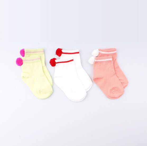 Комплект однотонных носок из трех пар с контрастными, пушистыми пампонами имеют стандартную длину и хорошо сидят на ноге. Благодаря качественному материалу гладкие носки подходят для детского сада и длительных прогулок.