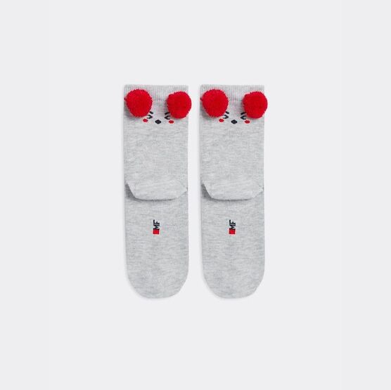 Детские носок с декором в виде помпонов и мордашки, выполнены из пряжи с высоким содержанием хлопка и легкие в уходе.