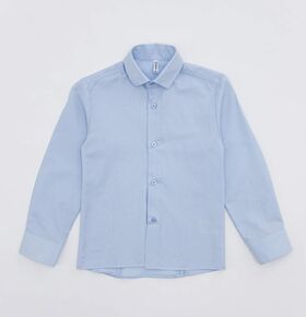 Синяя рубашка для мальчика имеет модный принт в виде пальм.