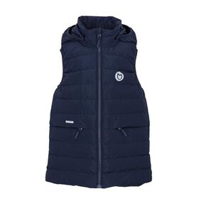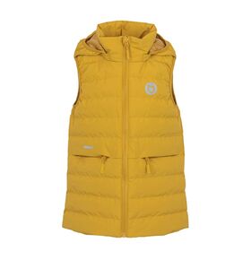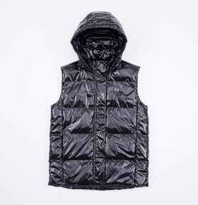 Черная жилетка объемного силуэта с капюшоном выполнена из материала с водоотталкивающими свойствами.