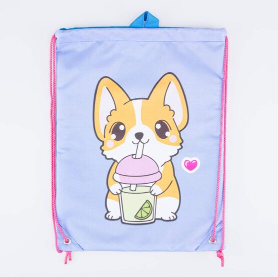Мешок для сменной обуви на завязках украшен принтом в виде корги и подходит для девочек.