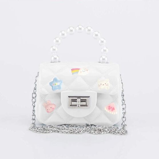 Элегантная конструкция с имитацией материала со стежкой. Короткая ручка декорирована крупными жемчужными бусинами, которые точно не оставят равнодушными юных модниц! Также есть цепочка, позволяющая носить сумку вторым способом: через плечо.